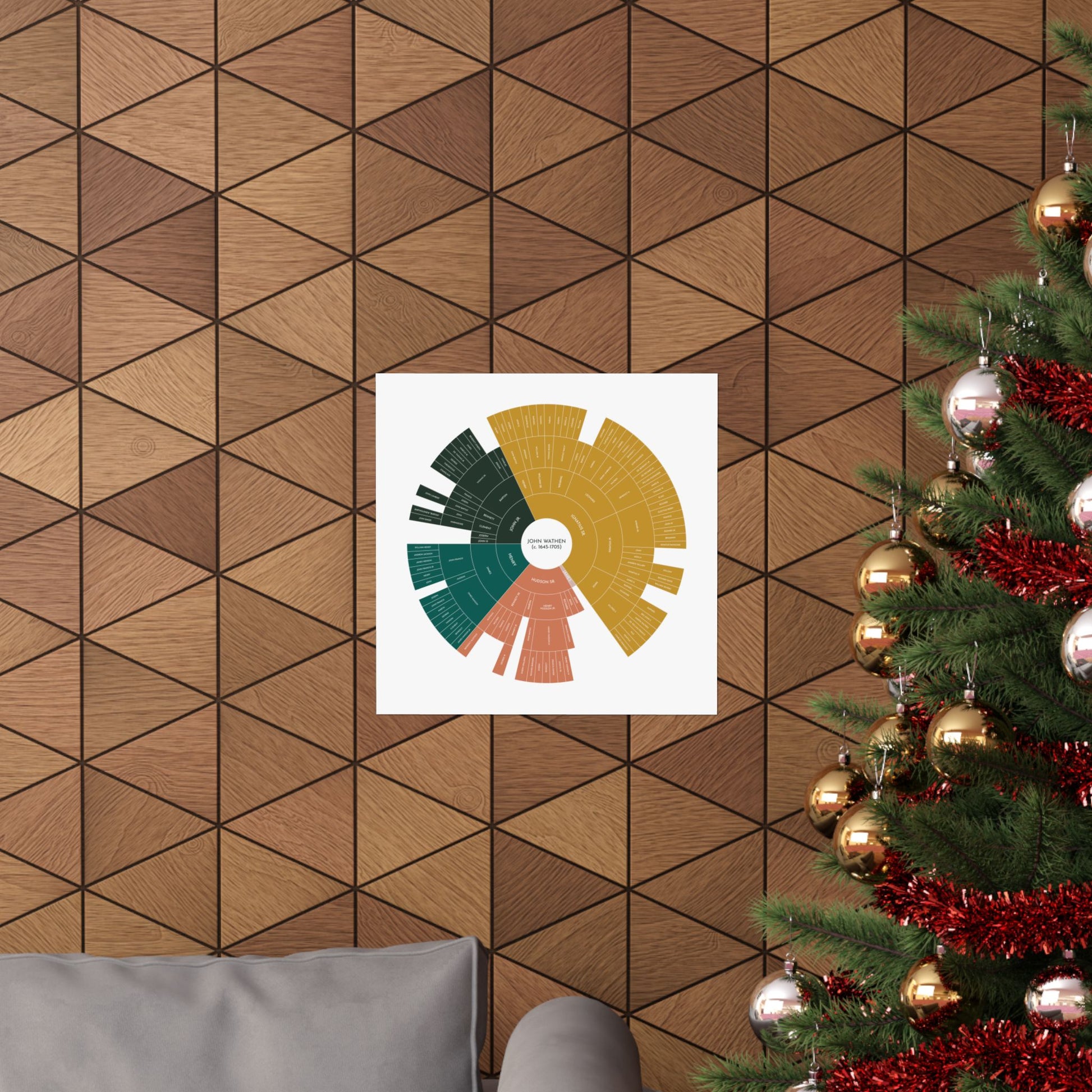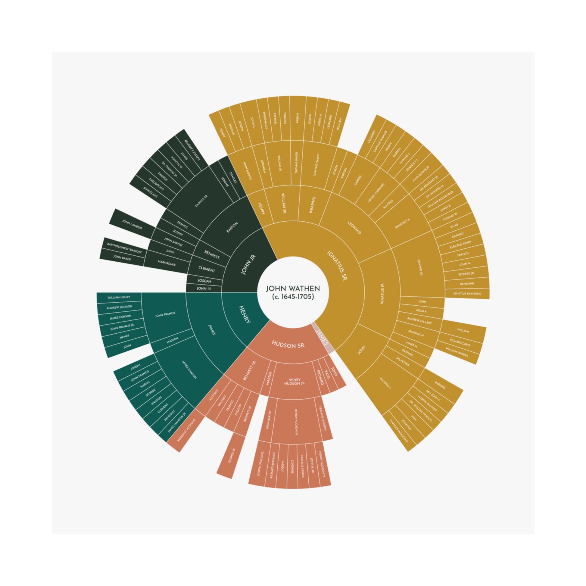 This beautifully designed circle descendancy chart traces the lineage of John Wathen, the 17th-century immigrant who arrived in Southern Maryland in 1670, and four generations of his male descendants. The attractive design presents complex genealogical information in a clear, elegant, and visually striking format, making it perfect for display in a home, office, or family gathering space.